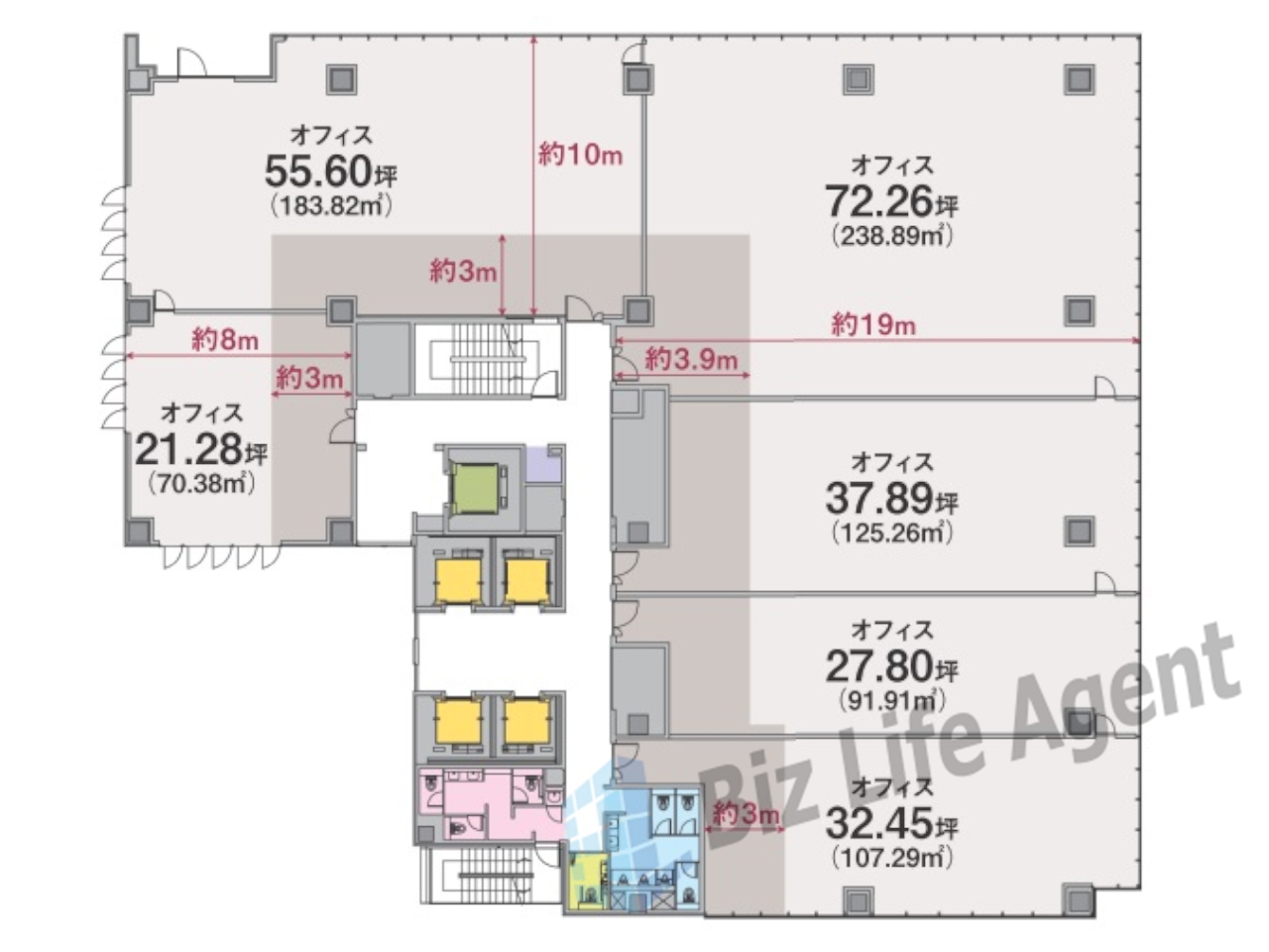 1フロア247坪から最小21坪まで様々面積帯にて提供が可能です。